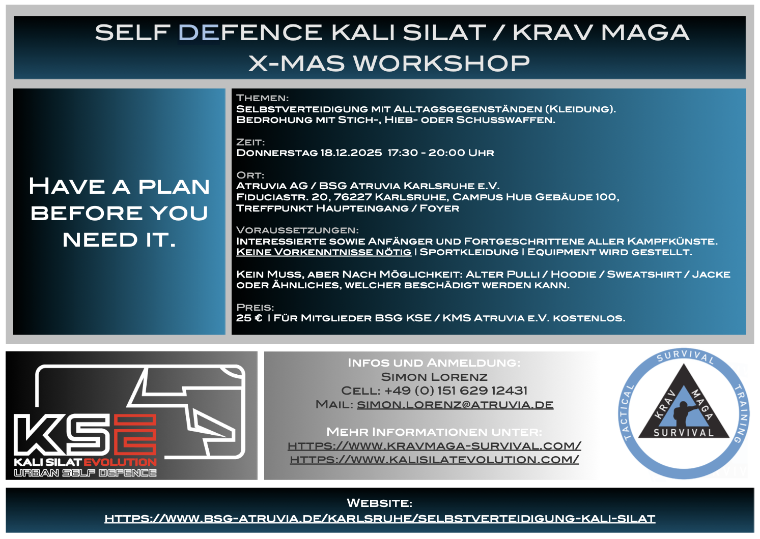 findet der X-Mas Workshop (alljährliches X-Mas Special) - Kali Silat Urban Self Defence / Krav Maga Survival statt.
